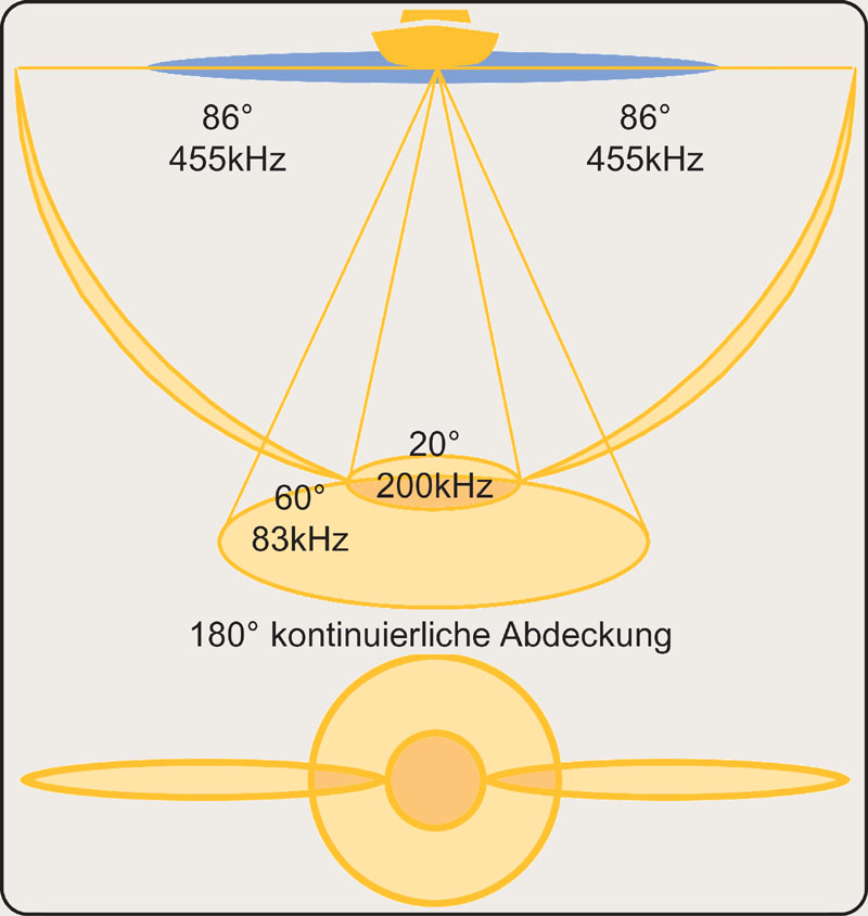 megjelenítésére szolgáló berendezés, 2x 455 kHz/86o –10dB mellett és további 2 x 600 kHz/72o HDSI – nagyfelbontású oldalirányú képkivetítés esetén. Ezzel az eljárással közel fotóminőségű víz alatti képeket kaphatunk. A víz alatti területek ilyen magas hatékonyságú feltérképezése mellett olyan horgászati eredményeket érhet el, amelyekről eddig nem is álmodhatott! Két, oldalirányban lesugárzó jeltapogató vizsgálja rendkívül vékony rétegekben az altalajt, hogy ez a rendkívül éles kép létrejöhessen. Az eredmény magáért beszél. A két letapogató 70 méteres mélységig dolgozik, s együttesen ca. 45 méteres mélységig érnek el. A rendszer kiegészül a Dual Beam Plus jeladó-kúppal, hogy a mély rétegek 2-dimenziós képeiről se kelljen lemondani. Az oldalirányú letapogatásnak köszönhetően nagy, széles területek tapogathatóak le, s a klasszikus Dual Beam Plusz rendszerrel.