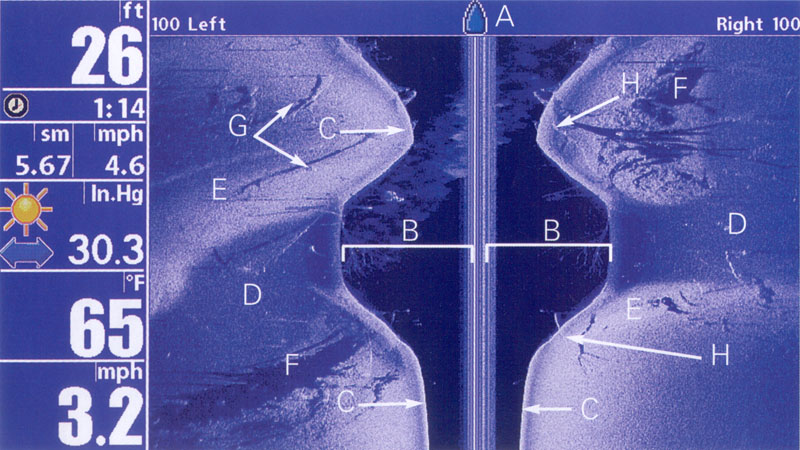 Tárgyak/objektumok/struktúrák: minden a vízmeder közelében található objektum, amely a halakat vonzza. Ezekhez tartoznak meredek vízmeder, dombok, nyílások, kiálló objektumok, mint pl. farönkök, bokrok és más vízalatti tárgyak mint pl. zátonyok, elsüllyedt hajók maradványai. A Humminbird készülékek ezeket a tárgyakat nagy felbontással és nagy felületen jelzik ki, ami a halászok számára nagyon kedvező.